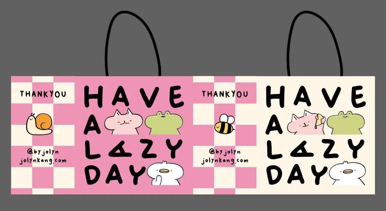 idea: I wanted something bright, square shape, and fit big lifestyle products like bottle, apparels and ceramics! I initially wanted to go with the factory that makes my angbao paper since the print was really nice but the sales person changed and was rushing me a lot :| so i looked for someone else which turned out to be a good call since she gave a template to put my design on which helps me visualise the bag better.